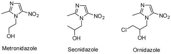 - Upcroft, J.A.; Campbell, R.W.; Benakli, K.; Upcroft, P.; Vanelle, P. Efficacy of New 5-Nitroimidazoles against Metronidazole-Susceptible and -Resistant Giardia, Trichomonas, and Entamoeba spp. Antimicrob. Agents Chemother. 1999, 43, 73–76. [Google Scholar] [PubMed]