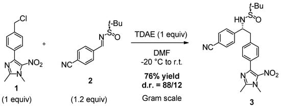 First, the reaction between 4-(4-(chloromethyl)phenyl)-1,2-dimethyl-5-nitro-1H-imidazole (1) and enantiopure aromatic N-sulfinimine 2 in the presence of TDAE at −20 °C for 1 h, followed by 16 h at room temperature, led to the corresponding amine 3 in 76% yield and with a good 88/12 diastereoselectivity as shown in Scheme 1.
