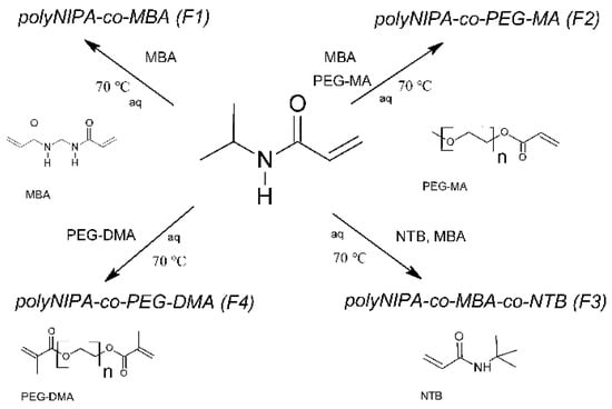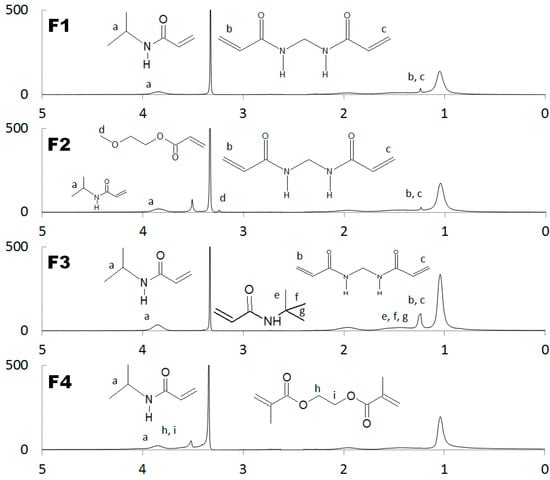 In order to determine the specific chemical structure of the synthesized polymers we carried out NMR analysis of the resulting compounds and all the components used in the synthesis. Information about the structure of synthesized NIPA derivatives was evaluated from the number of signals indicative for different kinds of protons in the molecule; position and intensity of signals was determined. The course of the polymerization reaction was clearly visible, as in all of the products (F1–F4, Figure 1) signals from the protons linked to the -C=CH bond present in the spectra of the monomer at 5.5–6.7 ppm disappeared. This confirms the absence of unreacted raw materials—monomers, oligomers, and co-monomers—in obtained products. In all NMR spectra of the obtained products the signals from protons observed around 3.85 ppm indicated the presence of a tertiary isopropyl group—δ 3.82 (1H, septet). The signals in the 1.25 ppm range confirmed the presence of protons of methylene groups in saturated N,N’-methylene bisacrylamide (MBA): δ 1.25 (3H, d), polymers F1–F3 on Figure 1. F2 polymer on the Figure 1 reveals signals of methoxy group—δ 3.34 (4H, s). Also, the incorporation of N-tertbutyl acrylamide (NTB) into the polymer was confirmed via the signals at 1.32 ppm, indicating presence of respective methylene group: δ 1.32 (1H, s)—F3 on Figure 1. The signals from the poly (ethylene glycol) dimethacrylate (PEG-DMA) were found in the specter of F4: δ 3.5–4.0 (multiplet) according to the identified ethylene group.