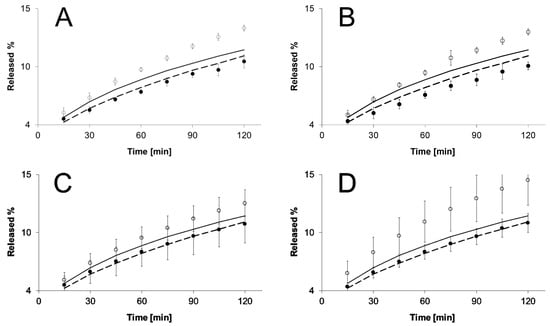 Release of NS from the formulations FP1 (A); FP2 (B); FP3 (C); FP4 (D) at 22 °C (●) and 42 °C (○) containing the thermosensitive polymers, the lines reflect release of NS from the HPMC reference gel (REF) at 22 °C (dotted, ---), and at 42 °C (solid line, -). The SD did not exceed 0.17 in the case of REF at 22 °C, and 0.93 at 42 °C.