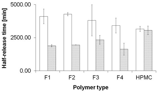 Half-release times for the NS released from the hydrogels based on thermosensitives polymers F1–F4 compared to HPMC hydrogel, at 22 °C (white columns), and at 42 °C (grey columns).
