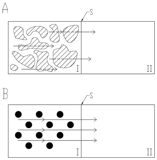 The schematic representation of naproxen diffusion (arrows) from donor compartment (I) to acceptor compartment (II) via semipermeable membrane at 22 °C (A) and 42 °C (B). The hatched region represents the polymer particles in expanded state, whereas the black dots represent the shrunken polymer.