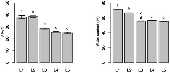 Clear external differences were observed among plants grown under 60 days of different light intensities. Compared with high light intensities (L3, L4, and L5), leaf areas were higher under low light intensities (L1 and L2). L2 resulted in the highest leaf area. Light intensity had different effects on E. pseudowushanense growth: L3, L4, and L5 resulted in higher number of branches. On the contrary, L1 and L2 resulted in higher SPAD and water content. The number of branches under L3, L4, and L5 were 156.3% (p < 0.05), 187.5% (p < 0.05), and 203.1% (p < 0.05) higher, respectively, than of plants grown under L1. SPAD values under L1 and L2 were 53.1% (p < 0.05) and 54.3% (p < 0.05) higher, respectively, than in plants grown under L5. Water content responded similarly. The highest values were observed in plants under L1 and the lowest were in plants under L5 (Figure 1).