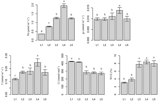 Figure 2 presents the effects of different light intensities on leaf photosynthetic parameters. Compared with L1, leaf net photosynthesis (Pn), transpiration rate (T), and water use efficiency (WUE) increased as light intensity increased, but not under L5. L4 resulted in the highest Pn, T, and WUE, whereas L1 resulted in the lowest measurements. Compared with L1, L4 increased Pn, T, and WUE by 457.9% (p < 0.05), 107.6% (p < 0.05), and 173.7% (p < 0.05), respectively. The highest gs values were observed under L4. No significant differences were observed between other treatments (p > 0.05). Compared with L1, intercellular CO2 concentration (Ci) decreased by 33.1% (p < 0.05), 34.3% (p < 0.05), and 36.2% (p < 0.05) under L3, L4, and L5, respectively.
