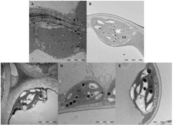 Chloroplast ultrastructure of E. pseudowushanense mesophyll cells under L1 (A); L2 (B); L3 (C); L4 (D); and L5 (E) treatment at 60 days. Abbreviation: SG, starch grains; GL, grana lamellae.