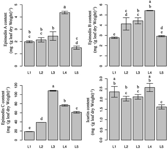 Epimedin A, epimedin B, epimedin C, and icariin content of E. pseudowushanense under different light intensities. The data are expressed as mean ± SD. Different letters indicate significant differences between light intensity treatments (p < 0.05); n = 30.