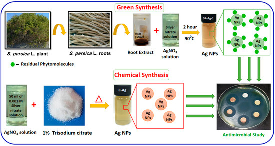 Graphical representation of green and chemical syntheses of silver nanoparticles (Ag-NPs) using S. persica L. RE and trisodium citrate, respectively, and evaluation of their microbicidal activities against various bacterial strains.