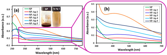 (a) UV-Vis spectra of pure S. persica L. RE (SP, green line). SP-Ag-1 (red line), SP-Ag-2 (blue line), SP-Ag-3 (orange line), SP-Ag-4 (cyan line), SP-Ag-5 (dark blue line), are the UV spectra of pure Ag-NPs prepared with 0.1 mL, 0.5 mL, 1.0 mL, 2.0 mL, and 3.0 mL RE, respectively; (b) Magnified image of Figure 2a. All the reactions were carried out for a period of 2 h, and the samples for the UV measurements were taken after final workup.