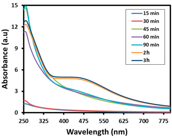 The environmentally friendly preparation of Ag-NPs was carried under reflux conditions using the S. persica L. RE. The reduction of Ag ions was confirmed by the obvious change in the color of the reaction mixture from light brown to dark brown. Notably, no color change was observed in the absence of RE, under a similar set of conditions. Initially, the formation of Ag-NPs was further confirmed by UV analysis, which is a significant method to observe the development and stability of Ag-NPs. For this purpose, the absorption spectra of pure RE and various samples of green synthesized Ag-NPs (SP-Ag) prepared by using different volumes of RE was measured as shown in Figure 2. The UV analyses of these samples have revealed that, in the beginning of the reaction, the process of nucleation started swiftly, which resulted in the fast formation of Ag-NPs for the first 60 min. This is clearly reflected in the UV spectra of Ag-NPs, where the intensities of the absorption bands at ~450 nm gradually increases during the first 60 min of the reaction (Figure 3). After two hours, the process of nucleation was slowed down and no further change in the intensity of the absorption band was observed even after several hours, which clearly indicated the completion of reaction.