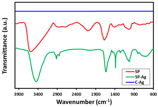 The twin role of the RE as a green reductant and stabilizing agent was established by comparing the Fourier transformed infrared (FT-IR) spectra of pure S. persica L. RE, green synthesized Ag-NPs (SP-Ag-NPs), and chemically synthesized Ag-NPs (C-Ag) as shown in Figure 4. In order to exclude any possibility of the presence of residual unbound phytoconstituents on the surface of the green synthesized Ag-NPs, the purified SP-Ag-NPs were redispersed in DI (deionized) water via sonication for 15 min. Subsequently, the NPs were isolated via centrifugation for 30 min at a speed of 9000 rpm. A similar process was repeated three times to isolate pure Ag-NPs.