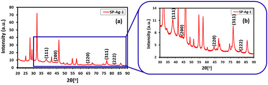 (a) X-ray diffraction (XRD) diffractogram of SP-Ag-NPs; (b) Magnified image of Figure 5a.
