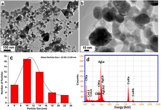 Transmission electron microscopy (TEM) and HRTEM (high-resolution) images of the Ag-NPs (a) overview; (b,c) Particle size distribution graph of Ag nanoparticles; (d) energy-dispersive X-ray spectroscopy (EDX) of Ag-NPs.