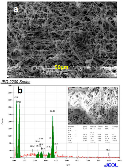 (a) Scanning electron microscopy (SEM) image; and (b) EDX of S. persica L. root extract.