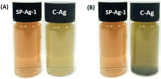 To compare the dispersion quality of both green synthesized Ag-NPs and chemically synthesized Ag-NPs, freshly produced Ag-NPs from both methods (Figure 10A) were dispersed in DI water. The samples for the comparison study were prepared by dispersing 5 mg of each substance in 10 mL of DI water via sonication. High quality dispersion was achieved for the green synthesized Ag-NPs as compared to the chemically synthesized Ag-NPs. After two days, the chemically synthesized Ag-NPs became unstable, whereas the green synthesized Ag-NPs still exhibited excellent dispersibility (Figure 10B). The enhanced dispersion quality of green synthesized Ag-NPs is attributed to the presence of residual organic moieties of the RE, which act as functionalization ligands and stabilize the as-prepared NPs in aqueous solution.