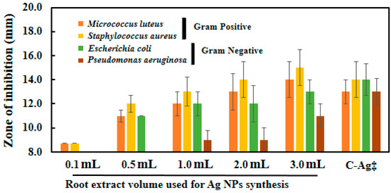 Increasing antimicrobial activity of Ag-NPs with the increasing volumes of RE used to synthesize the NPs was also observed in our previous study on Pulicaria glutinosa [41], mainly due to the increased solubility of the NPs. Although, in this study, the root extract of S. persica L., a plant with known antimicrobial activity and traditionally used for oral hygiene, was used [42]. However, the role of the aqueous extract was largely as a reductant for the synthesis of NPs as the concentration used for the synthesis was too low to show its own antimicrobial activity (10–300 µg/mL). It has been demonstrated in an earlier study that the aqueous RE of S. persica L. exhibited considerable antimicrobial activity at concentrations range of 50–400 mg/mL [43]. In this study, antimicrobial activity of the RE was tested at a very low concentration (300 µg/mL, which is ~100 times lower), therefore, no antimicrobial activity was observed. Hence, it can be concluded here that the increased activity of the Ag-NPs was mainly due to the improved solubility of the Ag-NPs rather than the microbicidal potential of the RE itself used for the synthesis of NPs. Higher antimicrobial activity against Gram-positive bacteria tested was observed than the Gram-negative bacteria. This may be due to the production of lipopolysaccharide (LPS) by Gram-negative bacteria, which may absorb the NPs on the outer surface of the bacterial cells. We obtained similar results in our previous studies on CuO and CoO nanostructures [35,44].