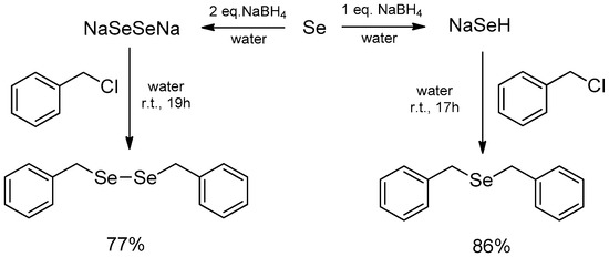 The reaction of benzyl chloride with aqueous solution of both the abovementioned reagents produced, after several hours at room temperature, the corresponding dibenzyl selenide (86% yield) and diselenide (77% yield), as depicted in Figure 1. This protocol represents an interesting alternative to a very old procedure that, using an alkaline aqueous solution of Rongalite® (hydroxymethansulfinate), provided the synthesis of NaSeNa [17].
