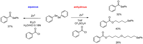 The selenium-selenium bond can be reductively cleaved in the presence of several metals; this represents an interesting strategy to introduce an organoselenium moiety in organic substrates having suitable electrophilic properties. Some of these reactions were carried out in the presence of water as a co-solvent, showing an interesting improvement in reactivity in terms of yields and reduced reaction time when compared with other organic solvents (Figure 2).