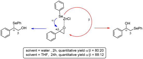 In parallel with the investigations carried out using the aqueous biphasic system, PhSeZnCl has also been used for the ring opening of several epoxides. In this case, it is worth mentioning that even if the reaction conditions are neutral the presence of the -ZnCl group confers to the molecule a Lewis acid character, which is enough to drive the regioselectivity of the ring opening of styrene oxide, leading the formation of the β-hydroxyselenide arising from the ring opening to the more hindered benzylic position (carbon α). The use of “on-water” conditions strongly accelerated the reaction, giving selenylated alcohols in good yield after 2 h at room temperature, compared with the 24 h required in THF. On the contrary, a moderate loss of regioselectivity was observed in water, probably because the non-solubility reduces the Lewis acid character of the reagent, disfavoring the interaction of the zinc with the oxygen atom of the heterocycle (Figure 7).
