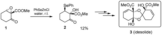 PhSeZnCl in “on-water” conditions was applied in a step of the total synthesis of idesolide (3) [35], a metabolite of Idesia polycarpa, studied as an inhibitor of apoptosis [36]. The ring opening of the epoxy keto ester 1 produces the β-selenoalcohol 2, allowing the introduction of a carbon–carbon double bond by oxidative elimination of the phenylseleno moiety and the formation of the corresponding allylic alcohol. Even if the reaction resulted in low yields (12%), PhSeZnCl was comparable or superior to all the other tested methods, including the classical Sharpless methodology [37] (PhSeSePh, NaBH4 in MeOH), which produced a complex mixture of unidentified compounds (Figure 8).