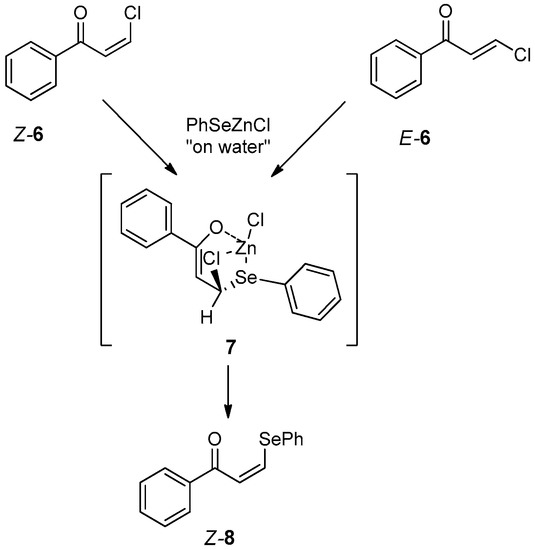Vinyl selenides can be obtained from PhSeZnCl using water as a reaction medium also toward vinyl substitution of the corresponding vinyl halides. The reaction in water is considerably faster than in THF and in all cases a stereo-retention on the geometry of the double bond was observed. Only in the case of the electron-deficient vinyl chloride 6 did the substitution from Z and E isomer occur with a stereo-convergent mechanism, producing Z-8 as a unique or major isomer. This aspect has been investigated using DFT calculation, which shows that the substitution passes through the intermediate 7 (deriving from a sort of Michael-type addition), starting from both the E-6 and Z-6 isomers (Figure 10) [41].