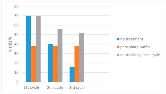 In addition, when the reaction was performed in water it was possible to recover and reuse the medium at last three times, increasing the greenness of the proposed methodology. The recyclability of the medium needed a treatment of the water in order to control the acidity generated during each reaction. In particular, reusing the medium caused the yields to drop dramatically after the first cycle. The use of a phosphate buffer produced moderate, if constant, yields in the three reactions, while the addition of sodium carbonate to neutralize HCl allowed good yields to be obtained in each cycle (Figure 11).