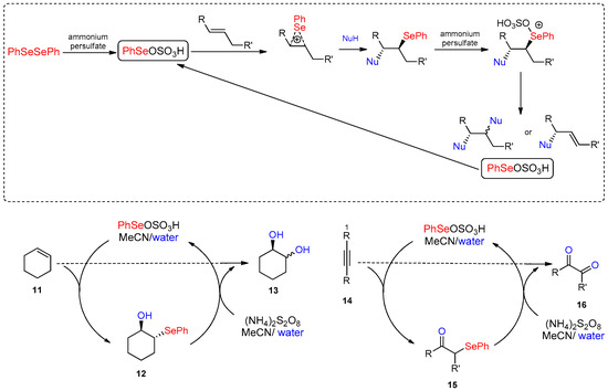 The use of water in the electrophilic functionalizion of carbon–carbon multiple bonds promoted by selenium reagents is a well-known way to introduce a hydroxyl or amido group as the nucleophilic counterpart of the selenium in the attack to an olefin [48]. When the electrophile is generated in situ by the oxidation of a diselenide with ammonium persulphate, an excess of oxidant can activate the selenium moiety of the phenylselenide intermediate (12, 15) toward a deselenation process that occurs by elimination or substitution, depending on the reaction conditions and the nature of the substrates. From the deselenation the electrophilic species is regenerated, allowing a catalytic role of selenium. When the substrate cannot stabilize the elimination product by conjugation and in the presence of a nucleophile (such as the water used as reaction medium), the selenonium salt (formed by the oxidation of the selenide intermediate) is replaced by a hydroxyl group, producing vicinal diol 13 from alkenes 11 and glyoxylic derivatives 16 from alkynes 14 [49,50] (Figure 12).