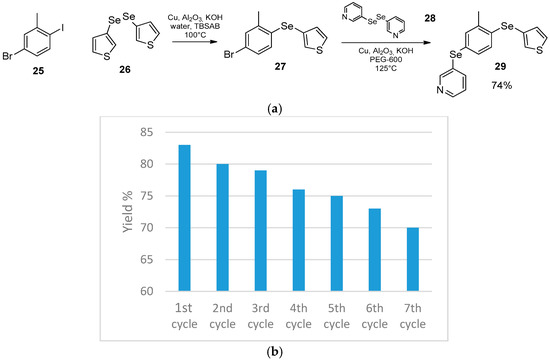 (a) Synthesis of the bisselenide 29; (b) Reuse of the catalyst in the reaction of 4-iodoanisole and diphenyl diselenide.