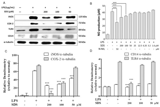 Effect of SDS on LPS-induced expression of iNOS, COX-2 protein and NO production. RAW 264.7 cells were pretreated with various concentrations of SDS for 1 h, followed by stimulating with LPS (1 μg/mL) for 24 h. (A) Representative pictures of Western blots and (C,D) quantitative analysis of blots. Each immunoreactive band was digitized and expressed as a ratio of α-tubulin levels; (B) NO level was measured by Griess reaction. L-NIL (N6-(1-iminoethyl)-lysine, hydrochloride, 50 μM) was used as positive control. Data are expressed as mean ± SD of three independent experiments. ** p < 0.01, *** p < 0.001, versus LPS-stimulated cells.