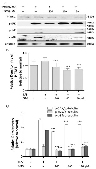 Effect of SDS on LPS-induced phosphorylation of TAK1 and MAPK. RAW 264.7 cells were pretreated with various concentrations of SDS for 1 h, followed by stimulating with LPS (1 μg/mL) for 30 min. (A) Representative pictures of western blots and (B,C) quantitative analysis of blots. Data are expressed as mean ± SD of three independent experiments. ** p < 0.001, *** p < 0.001, versus LPS alone.