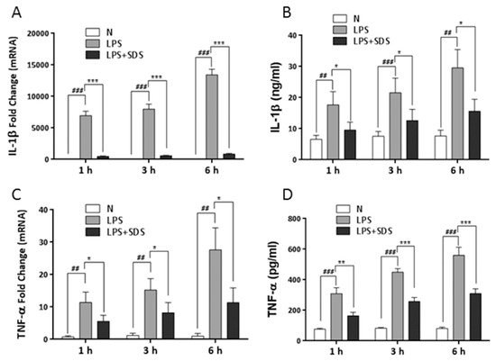 Specifically, incubation of cells with LPS resulted in a significant time-dependent induction of IL-1β and TNF-α mRNA and reach peak at 6 h (Figure 5A,C). IL-1β and TNF-α in the cultured medium were detected within 6 h after stimulation with LPS by ELISA (Figure 5B,D). IL-1β and TNF-α levels time-dependently increased and also reach peak at 6 h. Application of SDS effectively suppressed LPS-induced mRNA expression and protein secretion of IL-1β and TNF-α in RAW 264.7 cells. It indicated that SDS might transiently inhibit the synthesis and secretion of proinflammatory cytokines induced by LPS.