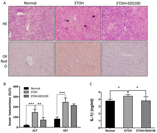 Effect of SDS on binge drinking induced liver injury. C57BL/6 mice were orally administrated SDS (100 mg/kg) for 5 days, followed by three gavages of dextrin maltose or ethanol every 30 min. (A) Representative H&E staining and Oil Red O staining of liver tissues; (B) serum ALT and AST; (C) serum IL-1β protein. Black arrows represent damaged hepatocytes. Values represent means ± SD. * p < 0.05, ** p < 0.01, *** p < 0.001, versus ethanol-fed group.
