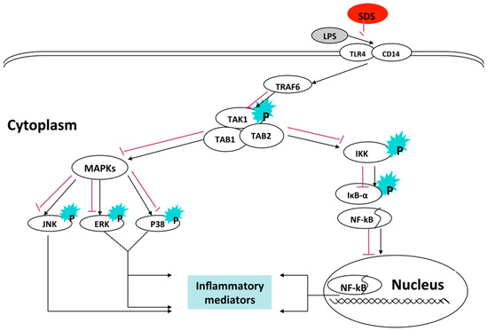 The suppression of LPS-induced inflammatory mediators by SDS is mediated by inhibition of TAKI phosphorylation, leading to inhibition of NF-κB and MAPK phosphorylation, eventually suppressing its proinflammatory target gene.