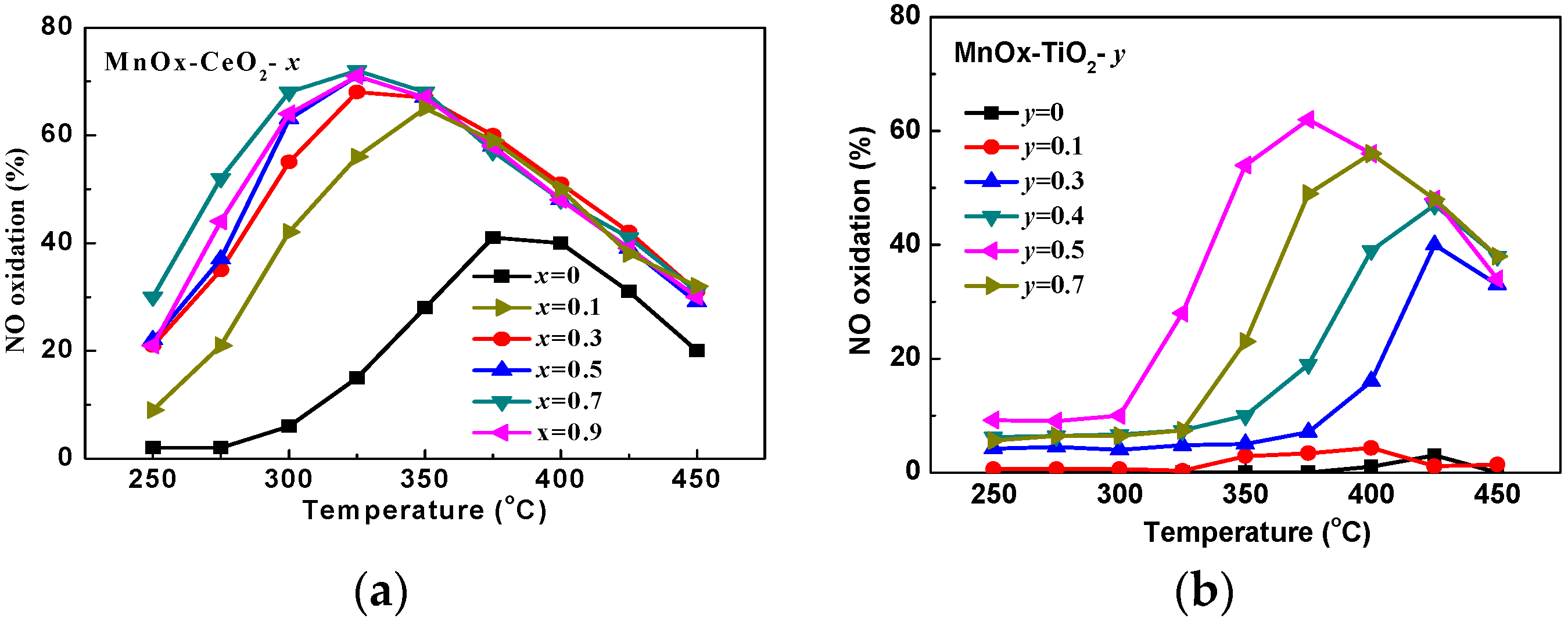 The catalysts for NO oxidation mainly include noble metal catalysts, transition metal catalysts, and molecular sieve catalysts. Noble metal catalysts exhibit high catalytic activity at low temperature, but are limited in industrial applications because of their high cost and poisoning problems [4,5,6,7,8,9]. Molecular sieve catalysts show certain catalytic activity but they are hydrothermally unstable and susceptible to structure collapse [10]. Transition metal oxides are cheap and also have good catalytic activity and, thus, can be appropriate catalysts for the catalytic oxidation of NO. Among the variety of transition metal catalysts, Co-based and Mn-based catalysts display the best catalytic activity for NO oxidation [11]. However, the applications of Co-based catalysts are retarded due to the toxicity of cobalt although they attract much attention [12,13,14,15,16,17,18,19]. Mn-based catalysts are considered as the promising candidates for NO oxidation to NO2. Many Mn-based catalysts (e.g., MnOx/TiO2 [20,21,22], Ce–Mn/TiO2 [23], FeMnOx/TiO2 [24,25]) have been studied. The results show that MnOx supported on TiO2 (P25) prepared by deposition-precipitation (DP) method and chemical vapor condensation method exhibits high catalytic activity. Additionally, NO oxidation efficiency can be enhanced by modifying MnOx/TiO2 with Ce and Fe. Most recently, many Mn-based catalysts (e.g., Mn–Ce–Ti [26], MnOx/CeO2–ZrO2 [27], MnO2/TiO2–Pal [28], Co–Mn/TiO2 [29], Fe2O3@MnOx@CNTs [30], and MnO2@NiCo2O4 [31]) have also been studied on the selective catalytic reduction of NOx, and they exhibit good catalytic activities. On the other hand, CeO2, as a carrier or promoter, also has been studied extensively because of its redox properties and exceptional ability to store and release oxygen. Meanwhile, studies also show that CeO2 possesses excellent ability to resist SO2 poisoning [23,32].