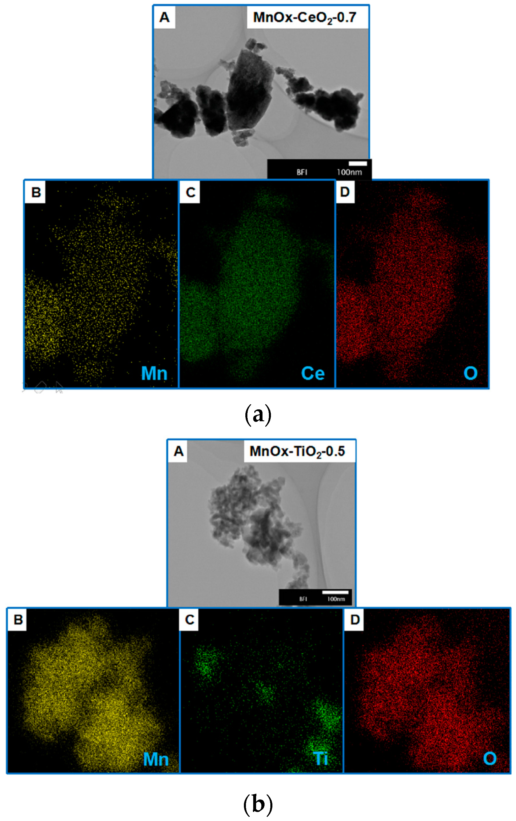 STEM images and their mapping analyses of MnOx–CeO2-0.7 catalyst (a) and MnOx–TiO2-0.5 catalyst (b). (A) STEM images of MnOx–CeO2-0.7 or MnOx–TiO2-0.5 catalysts; (B) Mn; (C) Ce or Ti; and (D) O.