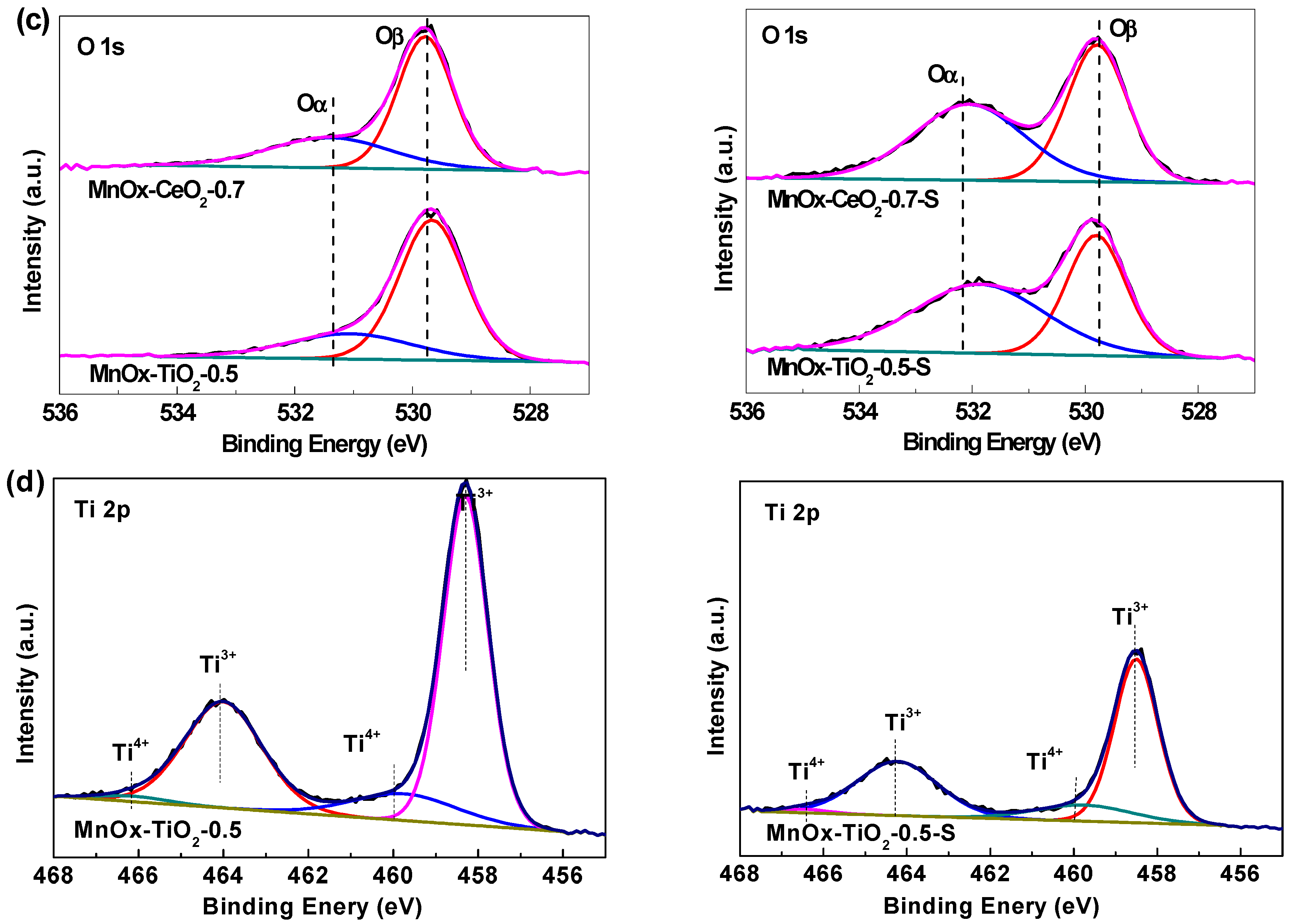 On the other hand, the Mn concentration of the MnOx–CeO2-0.7-S catalyst is almost the same to that of the fresh MnOx–CeO2-0.7 catalyst, while the Mn concentration of MnOx–TiO2-0.5 catalyst and the Ce concentration of MnOx–CeO2-0.7 catalyst decrease from 13.6% to 9.4% and from 26.4% to 19.7%, respectively, because of SO2 poisoning, which is attributed that the MnOx over MnOx–TiO2-0.5-S catalyst and CeO2 over MnOx–CeO2-0.7-S catalyst are partly covered with sulfate species [36]. Meanwhile, the ratio of Ce3+/(Ce3+ + Ce4+) of the MnOx–CeO2-0.7 catalyst also decreases from 41.6% to 25.2%, which indicates that cerium(IV) sulfate may be formed on the catalyst surface [40]. Therefore, we can deduce that SO2 might be preferentially adsorbed to the surface of CeO2 to form sulfate species, lessening the sulfation of MnOx active sites. It was also reported by Jin and co-workers [32] that the presence of CeO2 might partially prevent MnOx active sites from being sulfated. Waqif [41] investigated the adsorption of SO2 on CeO2–Al2O3, and concluded that ceria was a basic material for SO2 adsorption. Figure 4d shows the Ti 2p XPS spectra, four peaks are formed, referred to as Ti3+ at 458.3 eV, 464.1 eV, and Ti4+ at 459.8 eV, 466.1 eV, respectively [23]. Though the Ti3+ concentration is pretty high, it still cannot improve the resistance to SO2 poisoning.