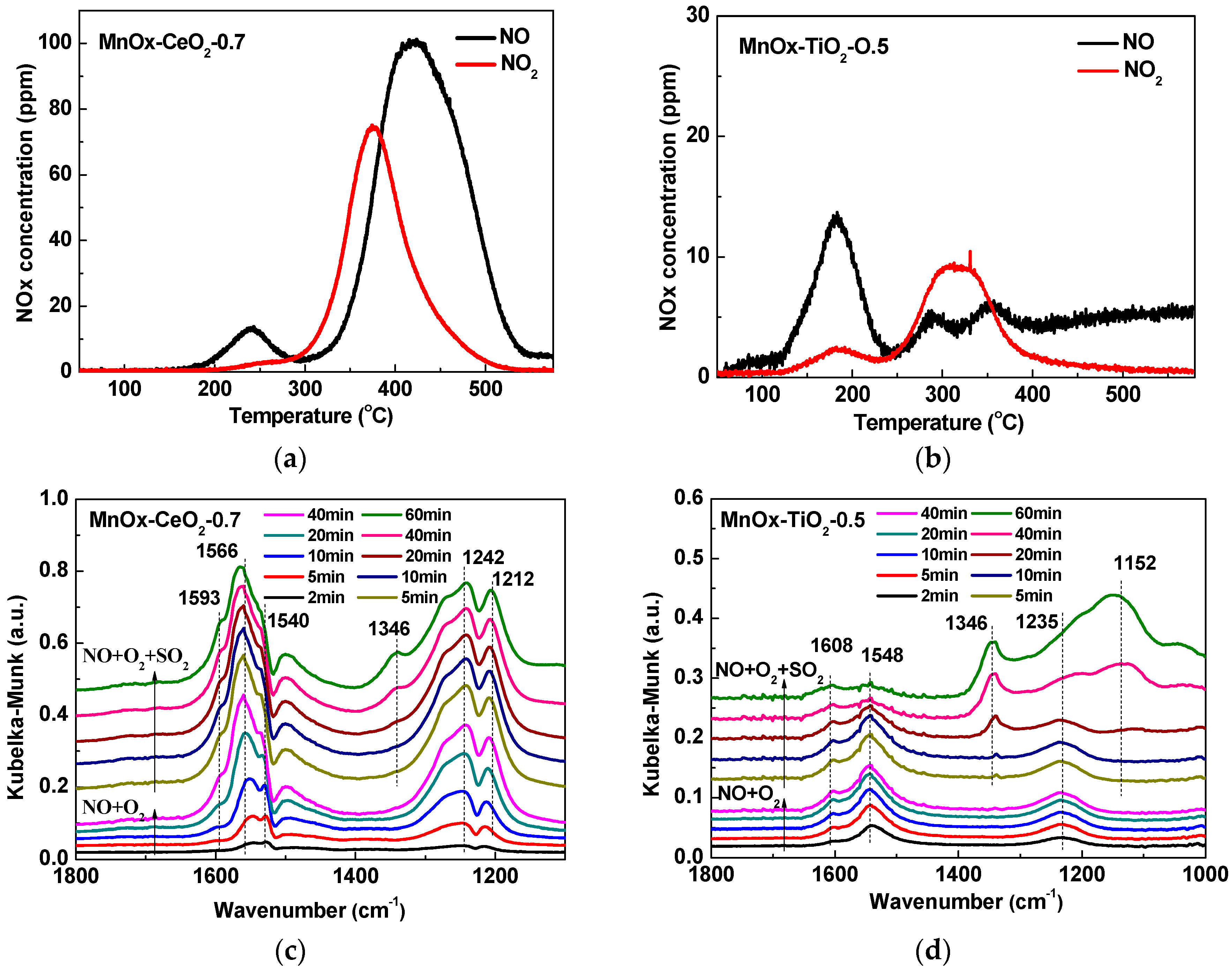 In order to understand the NOx adsorption behaviors and SO2 poisoning process, in situ DRIFTS measurements over MnOx–CeO2-0.7 and MnOx–TiO2-0.5 catalysts were carried out at 350 °C. Figure 7c,d shows the NO-O2 co-adsorption accompanied by SO2 adsorption. After introducing NO + O2, for the MnOx–CeO2-0.7 catalyst, the bands at 1593, 1566, 1540, 1242, and 1212 cm−1 are detected. All of the bands’ intensities gradually increase with the adsorption time until reaching their highest intensities and remain stable after about 40 min. The bands at 1566, 1540, and 1212–1242 cm−1 are assigned to bidentate nitrate, monodentate nitrate, and bridge nitrate, respectively [46]. A very weak band at 1593 cm−1 is due to the adsorption of NO2 [47]. For the MnOx–TiO2-0.5 catalyst, the bands attributed to monodentrate nitrate (1235 cm−1), bidentrate nitrate (1548 cm−1), and bridge nitrate (1608 cm−1) are observed [44]. The change trend of these bands’ intensities is similar to those over the MnOx–CeO2-0.7 catalyst. However, it is obvious that all of the adsorption bands’ intensities of the MnOx–TiO2-0.5 catalyst are significantly lower than those of the MnOx–CeO2-0.7 catalyst, which is probably one of the reasons that the MnOx–CeO2-0.7 catalyst has better activity than the MnOx–TiO2-0.5 catalyst in the absence of SO2.