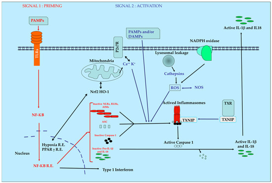 Simplified view of inflammasomes pathway. AIM: Absent In Melanoma receptors, ASC: apoptosis-associated speck-like protein, DAMPs: Danger-Associated Molecular Patterns, HO-1: Heme-Oxygenase 1, IL1-β: Interleukin 1 béta IL-18: Interleukin 18, NF-κB: Nuclear Factor-kappa B, NLRs: Nucleotide-binding domain and Leucin-rich repeat Receptors, NOS: Nitric Oxyde Species, Nrf2: Nuclear factor erythroid 2–Related Factor 2, PAMPs: Pathogen-Associated Molecular Patterns, PRRs: Pattern Recognition Receptors, R.E.: Responsive Elements, RLHs: Retinoic acid-inducible gene Like Helicase Receptors, ROS: Reactive Oxygen Species, TXNIP: Thioredoxin Interacting Protein, TXR; thioredoxin.