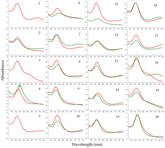 Comparison of the Ultraviolet-Visible Spectroscopy (UV-Vis) spectra for the AuNPs produced at 25 °C (green line graph) and at 70 °C (red line graph). The numbers on the spectra correspond to the numbers given to each plant in Table 1. Camellia sinensis (black tea) (18), Camellia sinensis (green tea) (19) and Epigallocatechin gallate (EGCG) (20) represent positive controls.