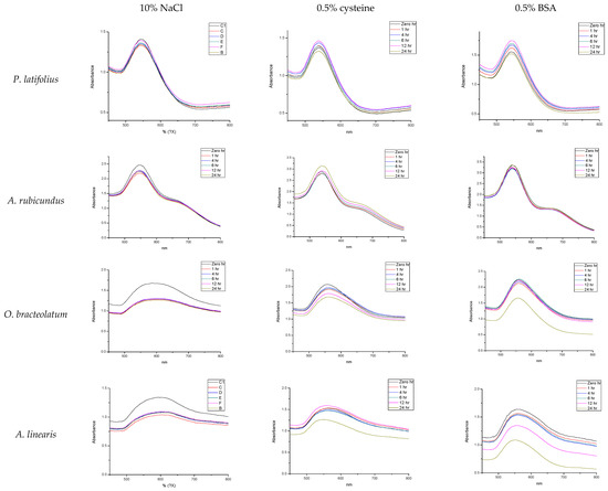 It is important that AuNPs, used in biological applications, retain their stability in biological environments. Biologically stable AuNPs are not expected to aggregate (manifested by minimal changes in their UV-Vis spectra) when placed, for extended periods, in buffers that simulate various biological conditions (e.g., salts and biological additives) [37]. In this study, the AuNPs were incubated with three different buffers solutions (10% NaCl, 0.5% cysteine and 0.5% Bovine Serum Albumin (BSA)). The stability of AuNPs was monitored by recording changes in UV-Vis spectra over time. Only AuNPs synthesized from P. latifolius and A. rubicundus demonstrated excellent stability by retaining their SPR (Figure 6). This indicates that these nanoparticles are highly stable at different environmental conditions and can therefore potentially be used in different biomedical applications. On the other hand, none of the other AuNPs synthesized from the other plant extracts showed a similar stability upon incubation with the same buffer solutions. For instance, the AuNPs generated from O. bracteolatum and A. linearis exhibited significant changes in their respective UV-Vis spectra as shown in Figure 6. It is suggested that the flattening in their SPR is due to the formation of larger particles. Also, the decrease of the intensities of the absorbance maxima may be due to the reduction of the AuNPs in terms of their number especially when incubated with 0.5% BSA.