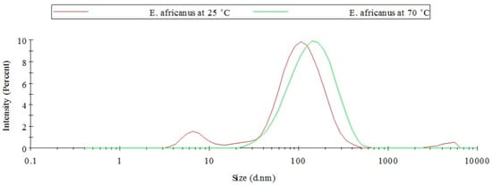 In order to view the effect of elevated temperature on the overall synthesis of the AuNPs, the average values of the PD, λmax, and Pdi values were calculated (Table 2). It was previously reported that high temperatures could produce AuNPs of better size distribution [31]. The measurement of the particle size distribution of some AuNPs synthesized in this study, produced data that support that report. For example, Figure 7 shows that at a higher temperature the AuNPs synthesized from E. africanus exhibited better size distribution in contrast to the AuNPs synthesized at a lower temperature. Overall, particles synthesized at 70 °C were smaller and better defined, which is also correlated with the blue shift of the λmax. This is in agreement with the study conducted by Mountrichas and co-workers [31]. Another study reported by Song et al. explained that the formation of smaller AuNPs at higher reaction temperatures are due to the fact that gold ions are consumed in the formation of the nuclei with the increase of reaction temperature as a result of an increased reaction rate, which prevents the secondary reduction process of the formed nuclei and hence stops the formation of larger AuNPs [38].