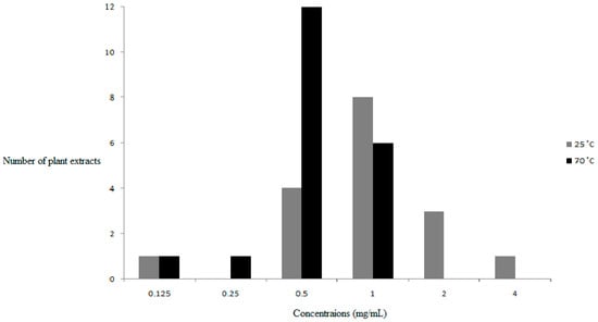 Fresh plant materials were dried in the shade for two weeks. After drying, the plant materials were grinded and extracted using boiled distilled water (50 mL of distilled water added to 5 g of each plant powder). The plant decoctions were then centrifuged at 3750 rpm for 2 h. The supernatants were then freeze dried. A stock solution of 32 mg/mL was freshly prepared for each extract before the screening step.