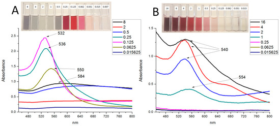 Ji and co-workers [40], observed that citrate AuNPs were produced, with larger diameter, when increasing the sodium citrate concentration above a certain limit. They showed that two different pathways can produce AuNPs resulting in AuNPs with different sizes. These pathways were dependent on the pH of the reaction medium. They established that above a certain critical pH value, the AuNPs grow differently via Ostwald ripening, which leads to the formation of larger AuNPs. In their study, the pH of the reaction mixture was dependent on the initial sodium citrate/gold salt ratio. In another study, Guo and co-workers [41] also reported that the pH of the reaction medium affects the synthesis of AuNPs from Eucommia ulmoides bark aqueous extract. They showed that at pH values above a certain optimum value the reaction mixture turned blue due to the formation of larger and aggregated AuNPs according to the authors. This was also observed in our study with EGCG at 8 mg/mL (see inset Figure 9A). While the P. latifolius extract at the highest concentration tested (16 mg/mL) started to give blue/red colour compared to the rosy red colour obtained at the OC (see inset Figure 9B). We presume a similar mechanism occurs in our study as a change in pH was detected between the smallest and highest concentrations, even if it was small changes.