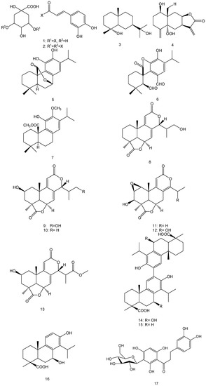 - Hussein, A.; Meyer, J.; Jimeno, M.; Rodríguez, B. Bioactive Diterpenes from Orthosiphon labiatus and Salvia africana-lutea. J. Nat. Prod. 2007, 70, 293–295. [Google Scholar] [CrossRef] [PubMed]