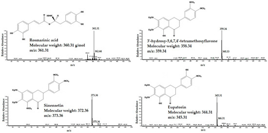 The High performance liquid chromatography-mass spectrometry (HPLC/MS) spectra of standard compounds: 3′-hydroxy-5,6,7,4′-tetramethoxyflavone, eupatorin, sinensetin and rosmarinic acid.