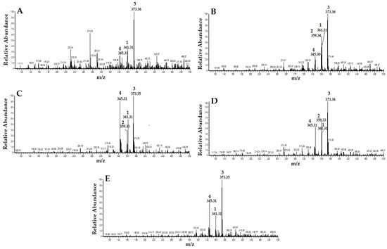 HPLC/MS spectra of different extracts of Orthosiphon stamineus (OS) (1: RA; 2: TMF; 3: SIN; and 4: EUP): (A) water extract (OS-W); (B) ethanolic extract of (OS-E); (C) methanolic extract of (OS-M); (D) 50% ethanolic extract (OS-EW); and (E) 50% methanolic extract (OS-MW).