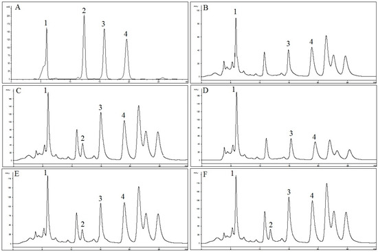 HPLC chromatograms of: (A) reference compounds (1: RA; 2: TMF; 3: SIN; and 4: EUP); (B) OS-W; (C) OS-E; (D) OS-M; (E) OS-EW; and (F) OS-MW at 330 nm.