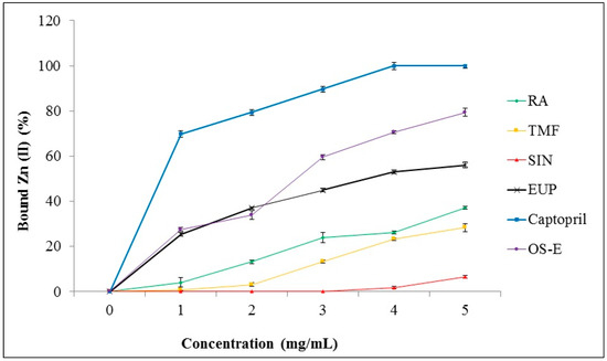 Capacity of zinc Ion (II) chelation by captopril, RA, TMF, SIN, EUP and OS-E was determined using a method described by Karamać [50]. Briefly, 0.01 M hexamine/HCl buffer was prepared at pH 5.0 with addition of 0.01 M KCl. Stock solution of captopril. RA, TMF, SIN, EUP, and OS-E were prepared in hexamine/HCl at concentration of 5 mg/mL. A series of working sample solutions were prepared by diluting the stock solutions with hexamine/HCl buffer (0–5 mg/mL). ZnCl2 was prepared in the same buffer at concentration of 0.8 mM. Then, 1 mL of sample solutions was mixed with 1 mL ZnCl2 solution and 0.1 mL tetramethylmurexide at concentration of 1 mM. Absorbance was recorded at 462 nm and 530 nm and then the ratio of A462/A530 was calculated. Distilled deionized water was used instead of tetramethylmurexide reagent in control samples. A standard curve of absorbance ratio versus metal ions concentrations (0 to 3.2 mM) was prepared and the percentage of bound metal ions was calculated.