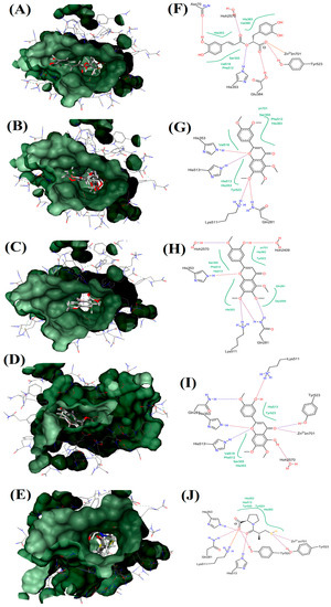 Visualization of ACE and OS extracts reference compounds interaction profile: Surface visualization of proteins in ACE with the ligands: RA (A); SIN (B); TMF (C); EUP (D); and Captopril (E). Active site residues interaction of protein in ACE with the ligands: RA (F); SIN (G); TMF (H); EUP (I); and Captopril (J). Hydrophobic interaction shown in green region.