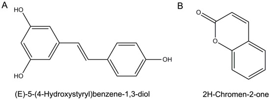 Molecular structural formula and chemical names of: resveratrol (A); and coumarin (B).