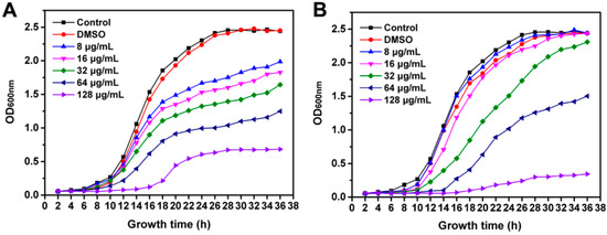 The bacterial growth curve of R. solanacearum in the presence of resveratrol (A) and coumarin (B) at concentrations ranging from 8 to 128 μg/mL. DMSO was indicated as a negative control and Control was used as bacterial cells treatmented with sterile water.